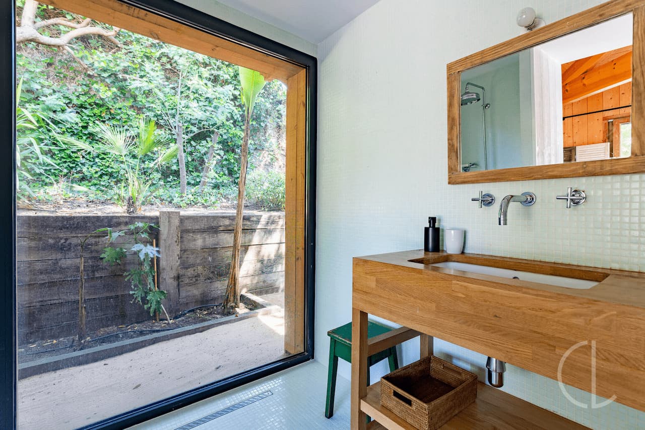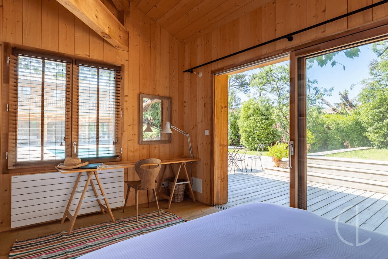 L’ensemble est complété par un cabanon d’invités avec une chambre (160), une salle d’eau et des toilettes invités.