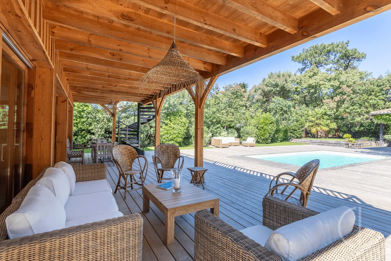 Ce balcon ajoute à la villa le charme des Cabanes sur Pilotis, traditionnelles du Bassin d’Arcachon.