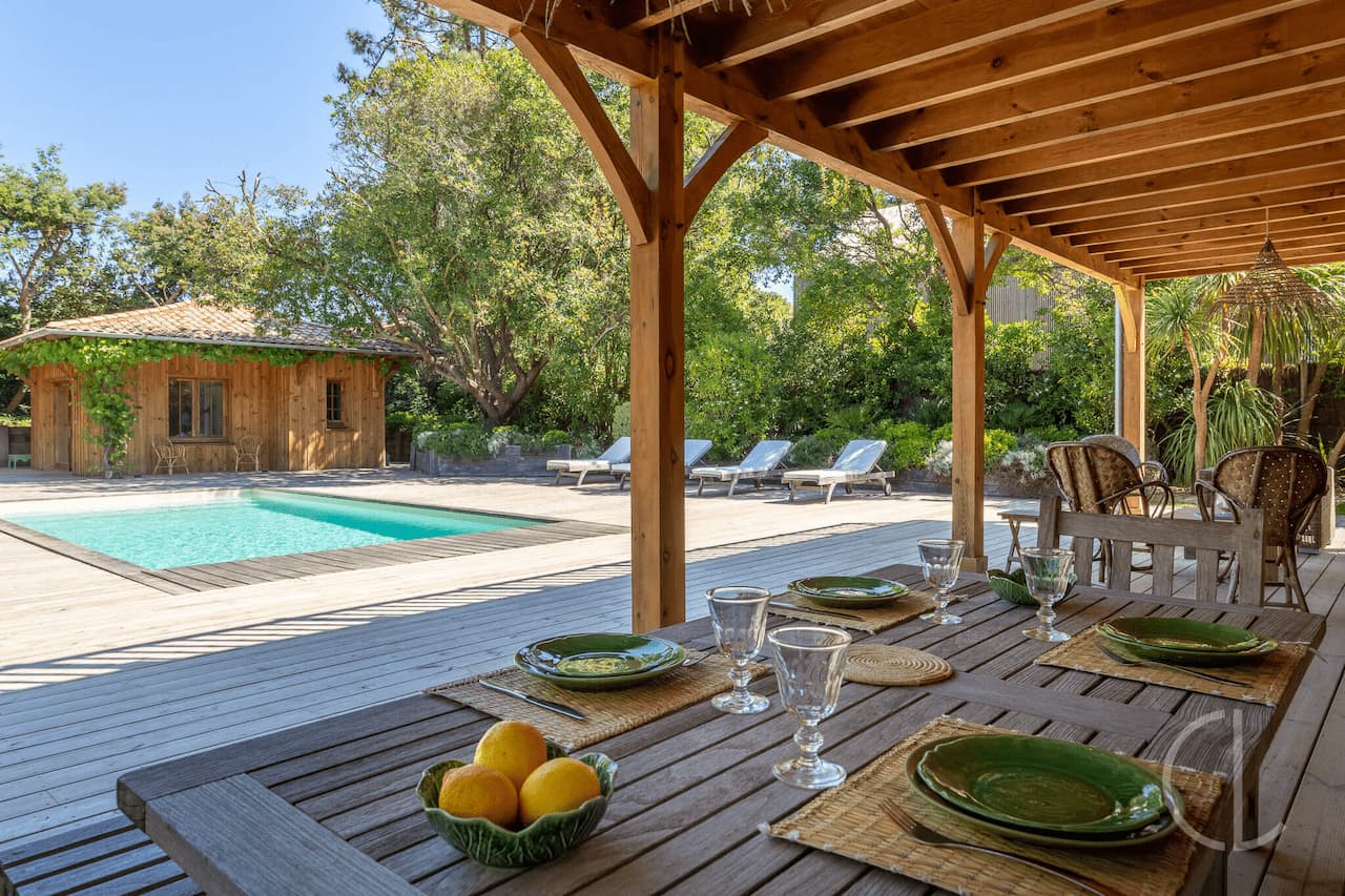 Le jardin paysagé avec sa grande terrasse en bois aménagée, sa piscine au sel chauffée (8×4) et sa douche extérieure vous permettront de profiter pleinement de vos vacances au Cap Ferret.