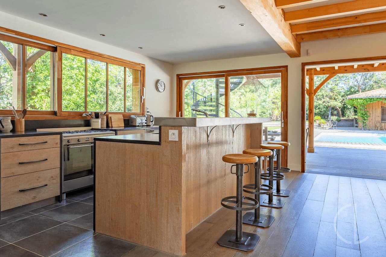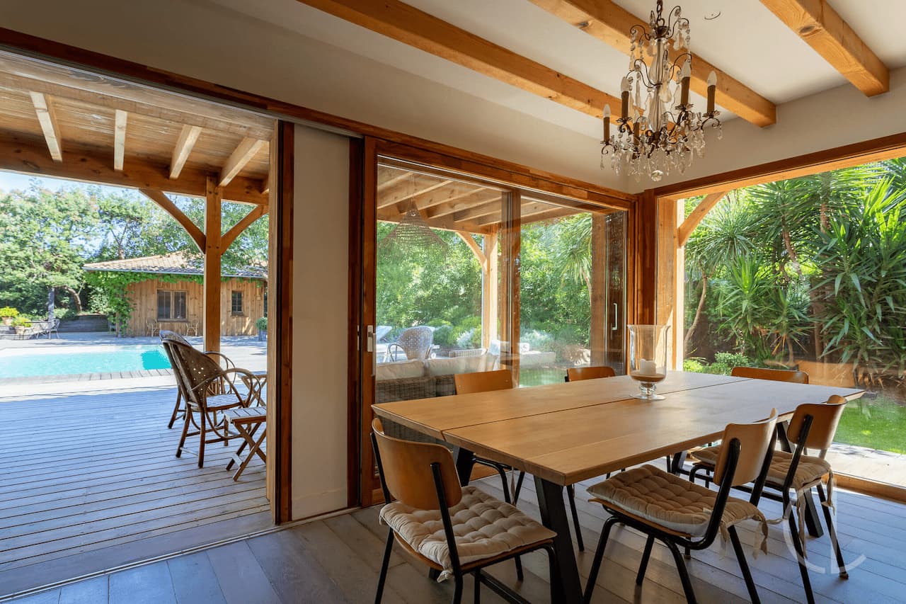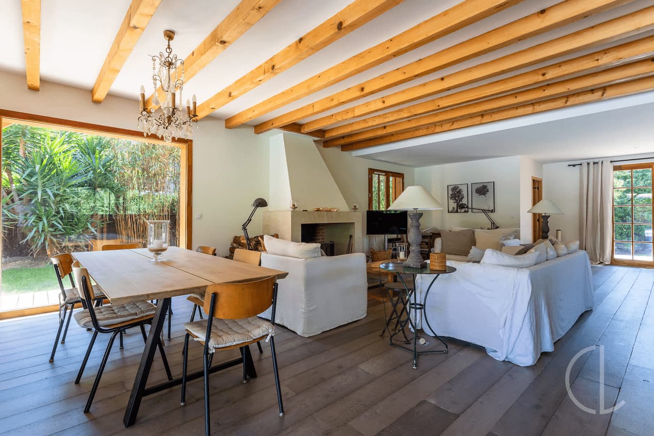 Elle comprend un grand séjour traversant avec son salon, sa salle à manger et sa cuisine ouverte. L’ensemble s’ouvre largement sur les espaces de vie extérieures.