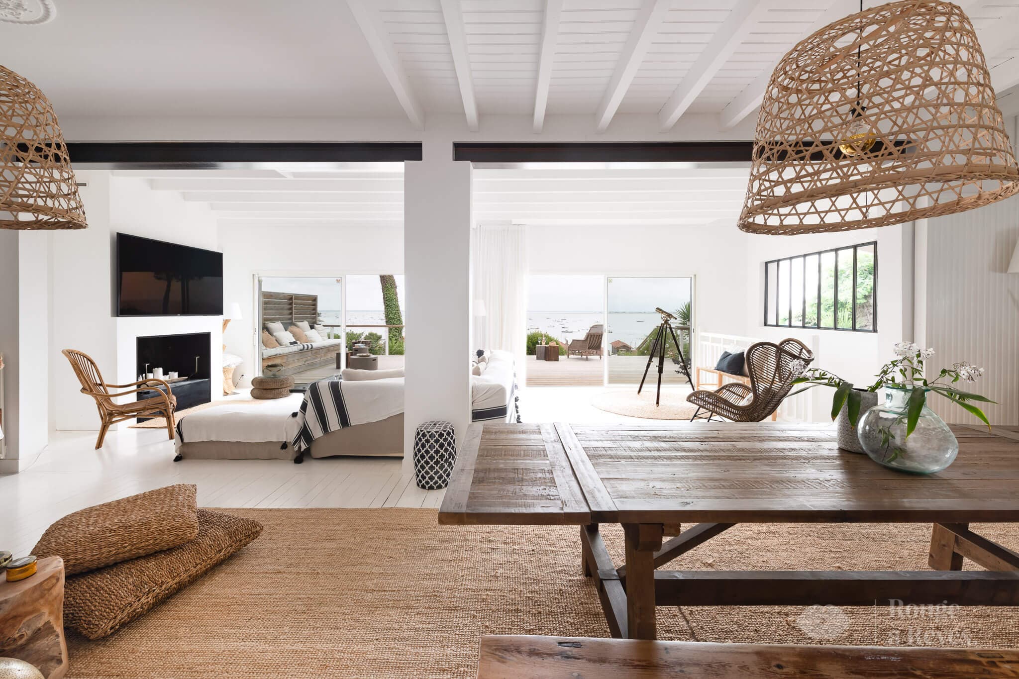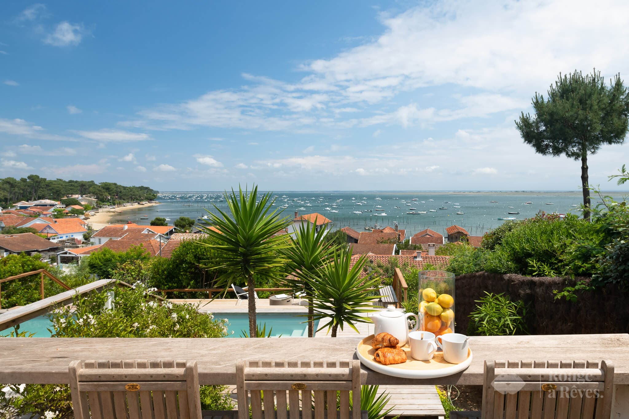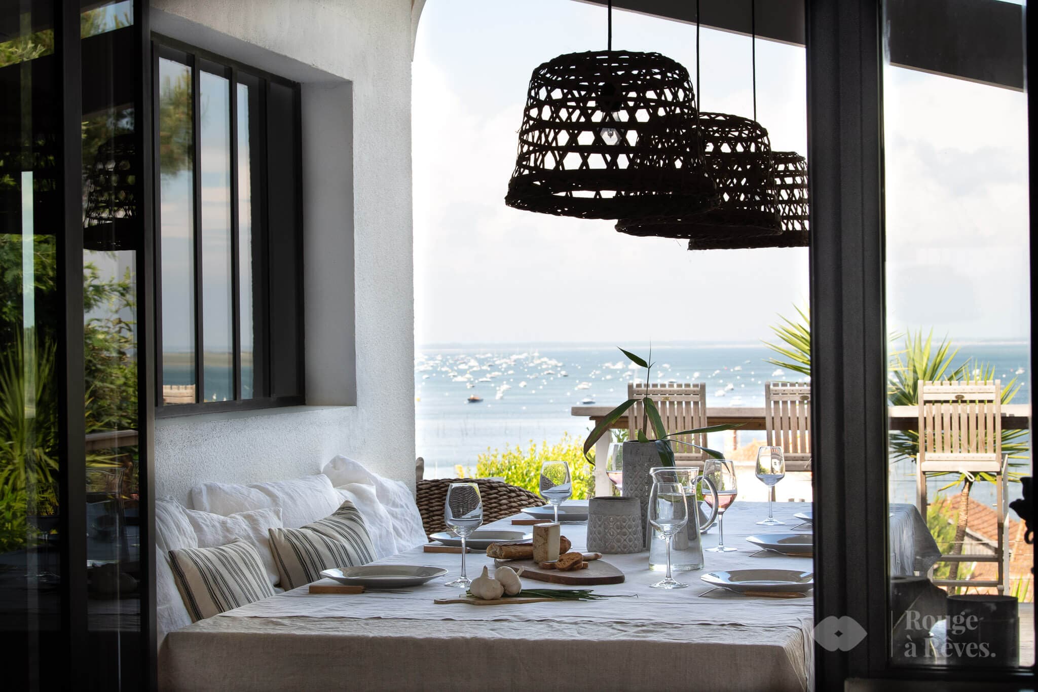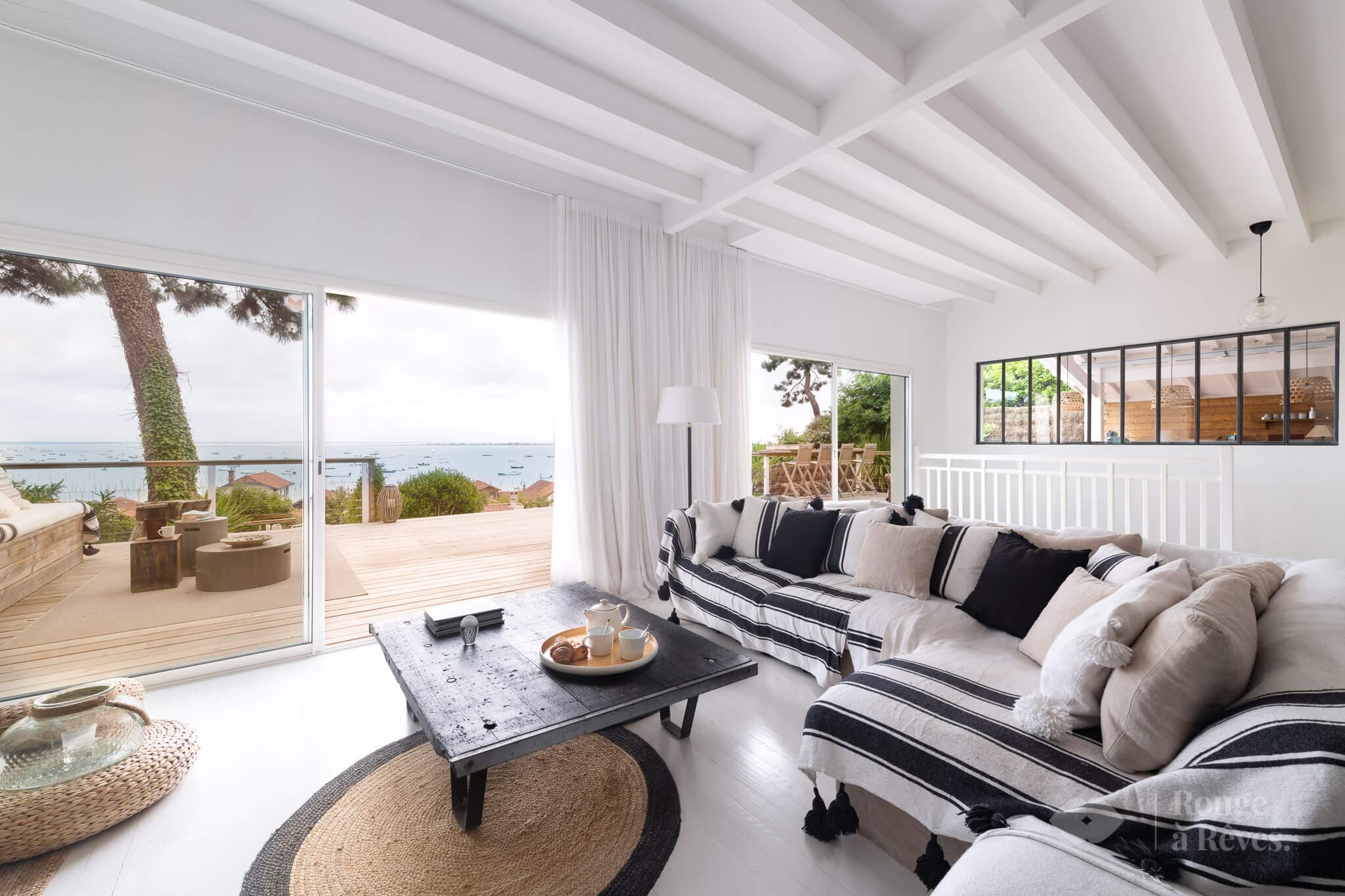 Cette villa, récemment rénovée avec goût, offre une vue mer exceptionnelle sur le Bassin d’Arcachon.