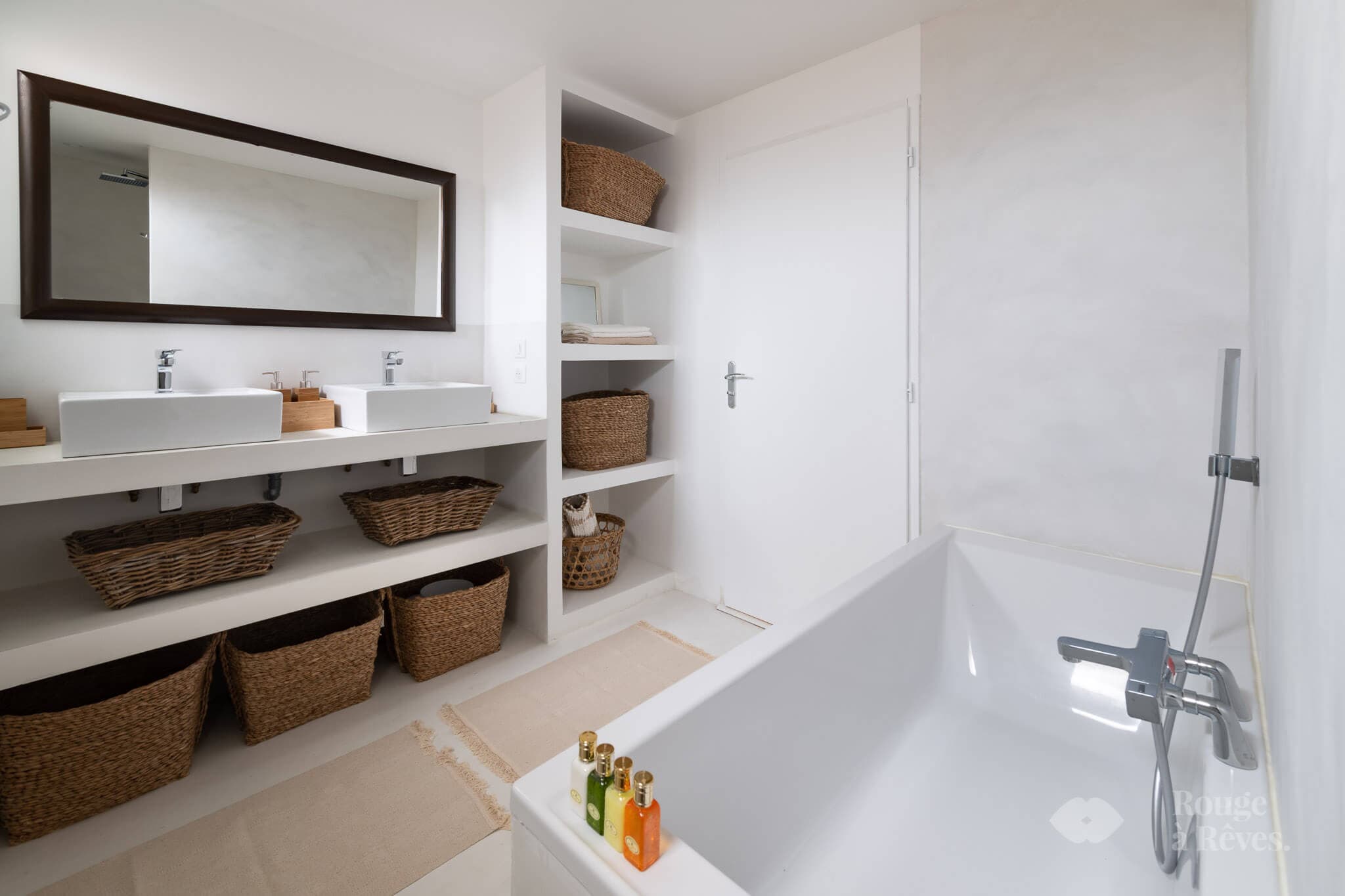 Elle comprend un grand séjour lumineux ouvert sur la terrasse extérieure, une cuisine ouverte équipée et deux chambres avec leurs salles d’eau respectives au premier niveau. Le rez-de-jardin accueille deux chambres, une salle de bain et une suite avec sa salle d’eau. L’ensemble est complété par un jardin paysagée, avec sa piscine au sel chauffée, qui surplomb l’ensemble du village ostréicole du Canon.