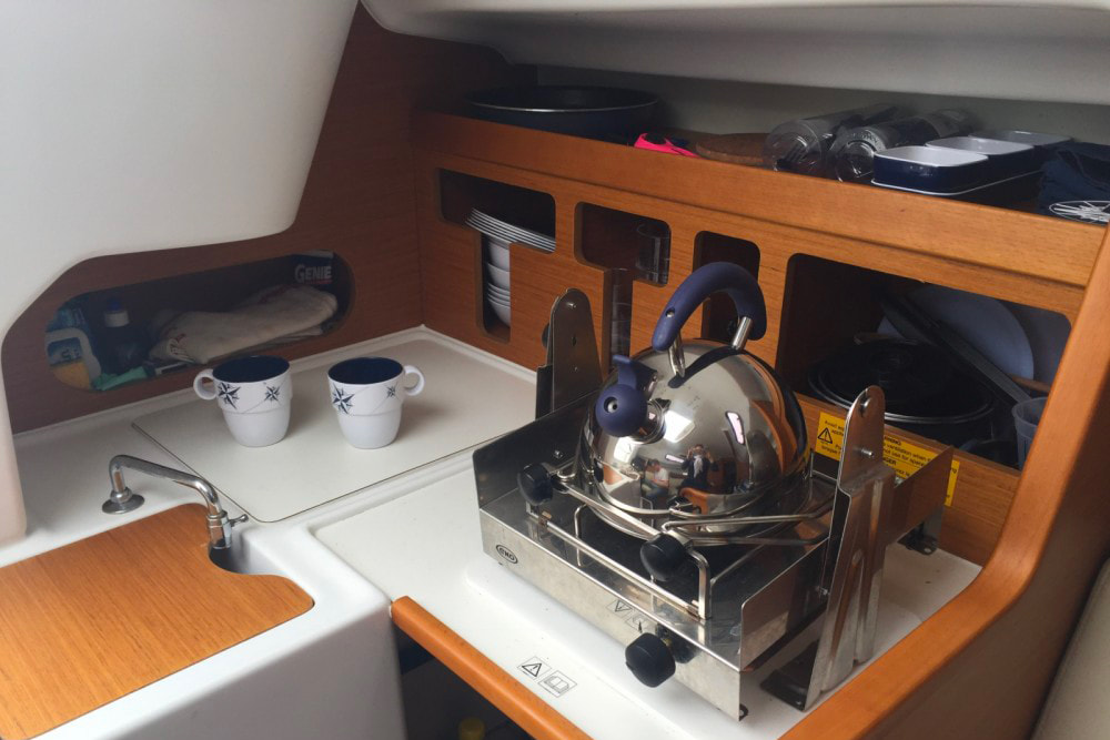 La cuisine est dotée d’un évier, d’un réchaud, d’une glacière (pains de glace disponibles dans les supermarchés) et du nécessaire pour les repas.
