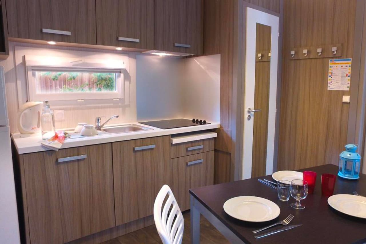 - Lodge 2 Pièces 4 Personnes : 25m² avec cuisine, canapé-lit et une chambre de deux lits simples jumelables.