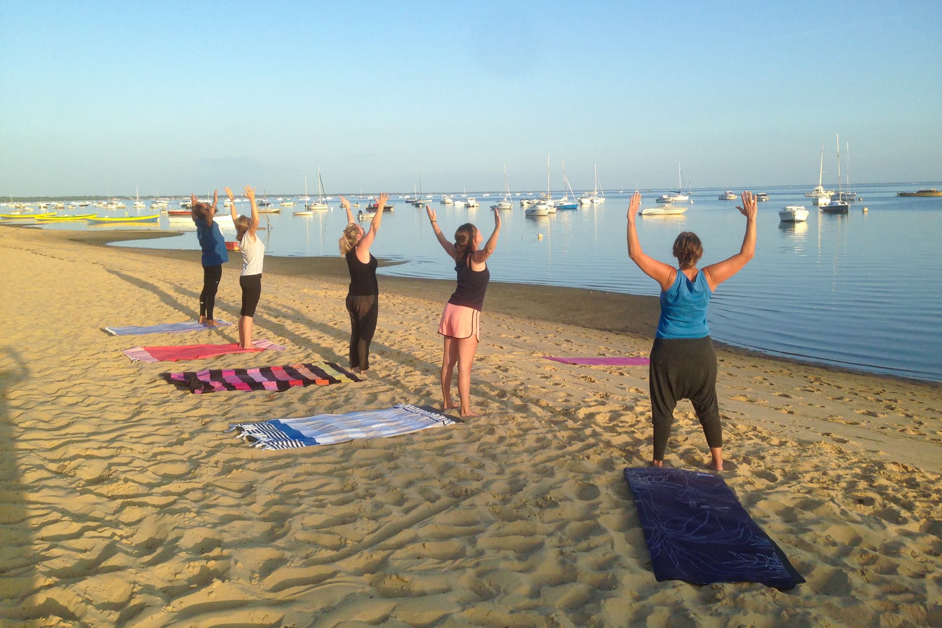 Pauline propose des cours de yoga toute l’année sur la presqu’île du Cap Ferret à domicile ou en petit groupe (4 personnes max) sur une terrasse en extérieure.